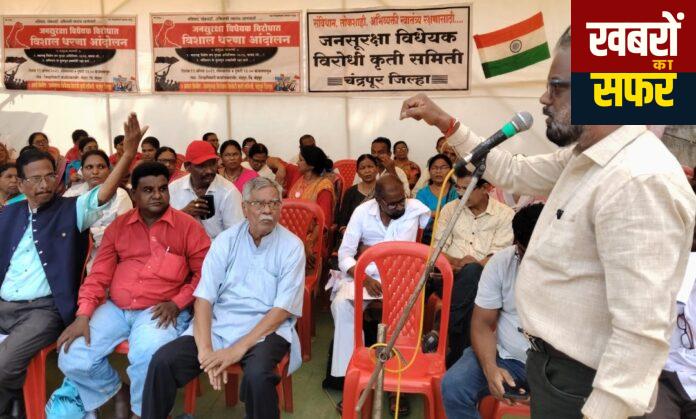 चंद्रपूर येतील नुकताच जनसुरक्षा विद्येयक विरोधी सर्व पक्षीय कृती समितीच्या वतीने धारणा निदर्शने आंदोलन कार्यक्रम जिल्हा अधिकारी कार्यालय परिसरात चंद्रपूर येते ऐक दिवसीय पार पडला या कार्यक्रमाचे अध्यक्ष अंकुश वाघमारे हे होते तर मंचावर प्रमुख अतिथी म्हणून कॉम्रेड प्रा नामदेव कनाके माजी सचिव भारतीय कम्युनिस्ट पक्ष कॉम्रेड राजू गैनवार माजी नगरसेवक व जिल्हा सहसचिव भारतीय कम्युनिस्ट पक्ष कॉम्रेड रामदास डाऊले जेष्ठ कम्युनिस्ट नेते हरीश भाई दुर्योधन जिल्हा अध्यक्ष पीपल्स रिपब्लिकन पार्टी ऑफ इंडिया कवाडे गट किशोर जामदार अशोक तुमराम किशोर पोतनवार अनिरुद्ध वनकर महाराष्ट्रiचे गायक इत्यादी अनेक नेते मंडळी उपस्थित होते