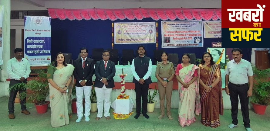 चंद्रपुर : जिल्हा विधी सेवा प्राधिकरण, चंन्द्रपुर व सुशिलाबाई रामचंद्रराव मामीडवार कॉलेज ऑफ सोशल वर्क, चंद्रपुर यांच्या संयुक्त विद्यमाने दिनांक २६/८/२०२५ रोजी दुपारी १२ वाजता प्रमुख जिल्हा व सत्र न्यायाधिश श्रीमती समृद्धी एस. भिष्म मॅडम यांच्या मार्गदर्शनाखाली सुशिलाबाई रामचंद्रराव मामीडवार कॉलेज ऑफ सोशल वर्क, चंद्रपुर येथे कायदेविषयक जनजागृती कार्यक्रमाचे आयोजन करण्यात आले. सदरील कार्यक्रमात श्री. एस.एस.ईगळे साहेब, सचिव, जिल्हा विधी सेवा प्राधिकरण तथा दिवाणी न्यायाधिश व स्तर चंन्द्रपुर, श्री.पि.पि.कुलकर्णी साहेब, मुख्य न्यायदंडाधिकारी, चंन्द्रपुर, श्रीमती प्रभावती टि. ऐकुर्के मॅडम, पोलीस निरीक्षक, भरोसा सेल, चंन्द्रपुर, अँड. महेन्द्र बी. असरेट यांनी विद्यार्थ्यांना विविध कायद्याबाबतचे मार्गदर्शन केले. या प्रसंगी महाविद्यालयाच्या प्राचार्या श्रीमती ठाकुरवार मॅडम, प्रा. कापसे मॅडम, प्रा. नरखेडकर मॅडम, प्रा. बोरकुटे, प्रा. रामटेके सह समस्त प्राध्यापक वृंद व विद्यार्थी मोठ्या संख्येने ऊपस्थीत होते. कार्यक्रमाचे संचालन प्रा. राठोड सरांनी तर आभार प्रदर्शन प्रा. आडे सरांनी केले.