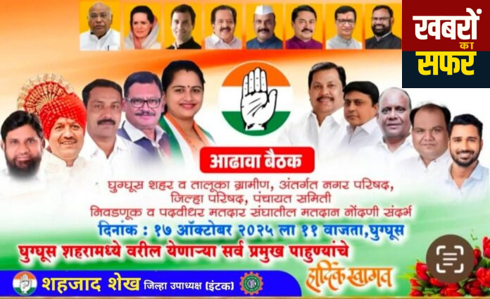 घुग्घुस : स्थानिक स्वराज्य संस्थेच्या घुग्घूस नगर परिषद, पडोली जिल्हा परिषद व पंचायत समिती, नकोडा मारडा जिल्हा परिषद व पंचायत समिती (चंद्रपूर) अंतर्गत येणाऱ्या सर्व काँग्रेस पदाधिकारी तसेच सर्व आजी माजी पदाधिकारी सर्व फ्रंटल ऑरगनायझेशनचे पदाधिकारी व सदस्यगन आदरणीय कार्यकर्ता आपणास कळविण्यात येते की निवडणूकीच्या पूर्व नियोजना करीता आढावा बैठक घेण्यात येत असून दिनांक 17 ऑक्टोबर 2025 रोजी