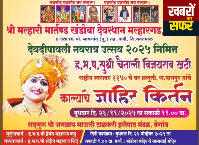 नायगाव (बु.), ता. वणी, जि. यवतमाळ येथील प्रसिध्द श्री मल्हारी मार्तंड खंडोबा देवस्थान मल्हारगड, कवडशी येथे दरवर्षीप्रमाणे यंदाही देव दिपावली नवरात्र उत्सव २०२५ चे आयोजन करण्यात आले असून हा उत्सव दि. २१ नोव्हेंबर ते २६ नोव्हेंबर २०२५ या कालावधीत भक्तिमय वातावरणात साजरा होत आहे. या पवित्र नवरात्र उत्सवाची सुरुवात शुक्रवार, दि. २१ नोव्हेंबर रोजी मूर्तीस्थापना, सप्तशती पारायण आणि विविध धार्मिक कार्यक्रमांनी झाली. सहा दिवस चालणाऱ्या या उत्सवात दररोज आरत्या, महिलांसाठी मंगळागौर, कीर्तन, भजन, नृत्यसंगीत तसेच धार्मिक व सांस्कृतिक कार्यक्रमांची मेजवानी भक्तांना मिळणार आहे. उत्सवाचा प्रमुख सोहळा बुधवार, दि. २६ नोव्हेंबर २०२५ रोजी सकाळी ११ वाजता होईल. यावेळी सुप्रसिद्ध राष्ट्रीय कीर्तनकार ह.भ.प. सुश्री चैताली विजयराज खटी (नागपूर) यांचे कीर्तनाचे आयोजन करण्यात आले आहे. तसेच या दिवशी सकाळी ९ वाजता खंडोबा महाराजांच्या पालखीचे भव्य प्रस्थान होणार आहे. दैनिक कार्यक्रमात मूर्तीस्थापना, सप्तशती वाचन, महिलांसाठी मंगळागौर, भजन, कीर्तन, सांस्कृतिक कार्यक्रम, पारंपरिक वाद्यवृंद, भक्तीगीत. दि. २६ रोजी महाप्रसाद या उत्सवाचे आयोजन श्री मल्हारी मार्तंड खंडोबा राया सेवा समिती, कवडशी, पुनवट यांच्या वतीने करण्यात आले आहे. परिसरातील सर्व भाविकांनी उपस्थित राहून देवदर्शनाचा लाभ घ्यावा, असे आवाहन आयोजकांनी केले आहे.